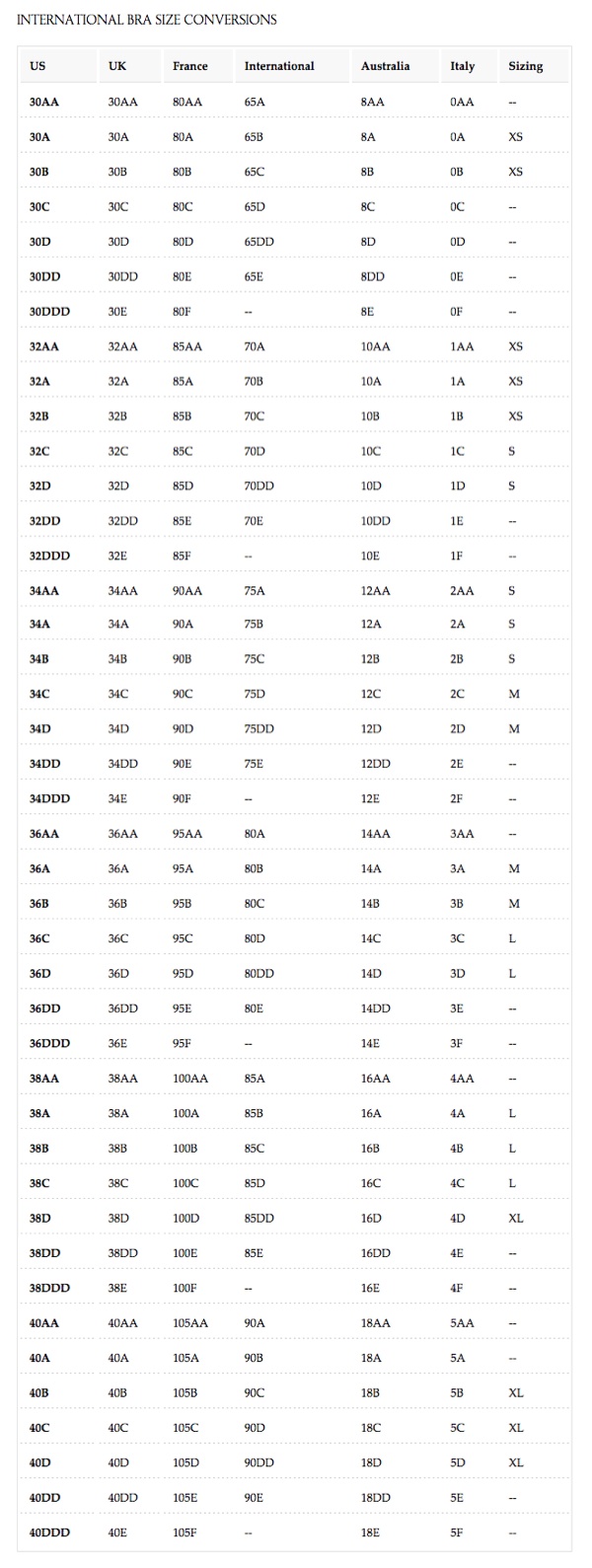 下面的尺寸表是維多莉亞的秘密的胸罩尺寸國際換算表,